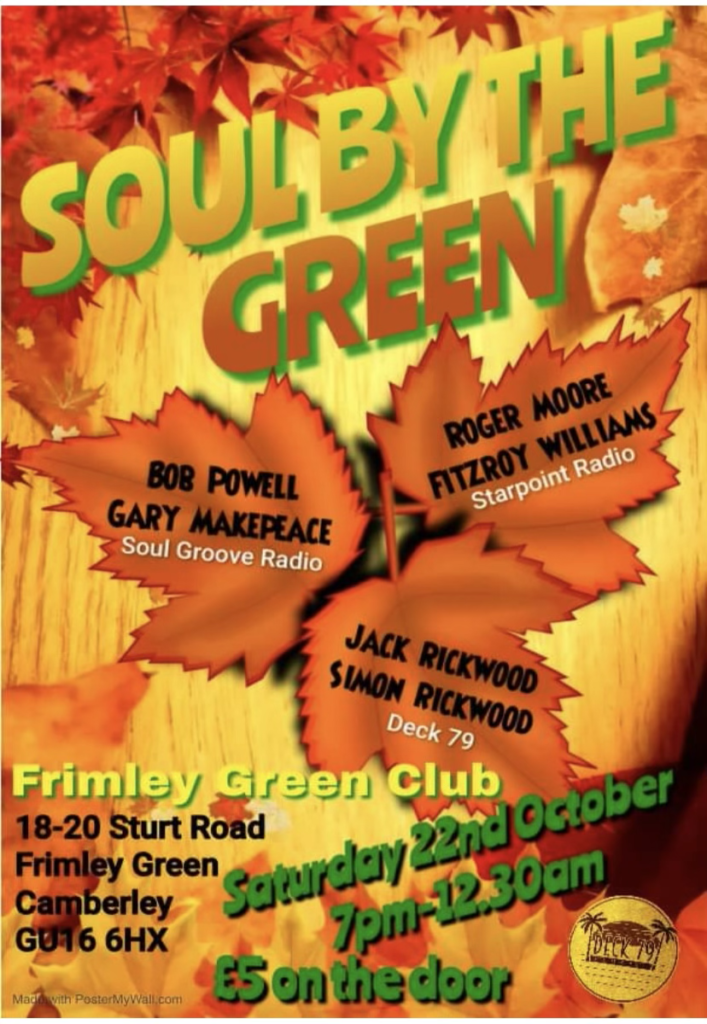A big Soul Event at the Frimley Green Club. We have DJ’s playing the best of Soulful House, Jazz and Latin, with a bit of Northern, R&B and rare Groove thrown in. Music starts at 7pm until 12.30am. Food will be available. £5.00 on the door for non-members. Brilliant evening with great music for the over 30’s.