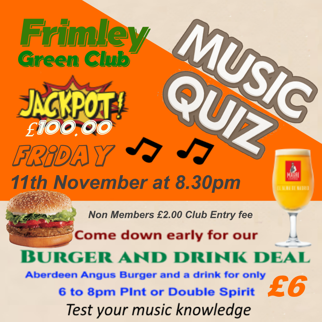 We have a fantastic Music Quiz at Frimley Green Club from 8.30 pm on Friday 11th November 2022. First Prize is £20.00 and a chance of winning the £100.00 +...