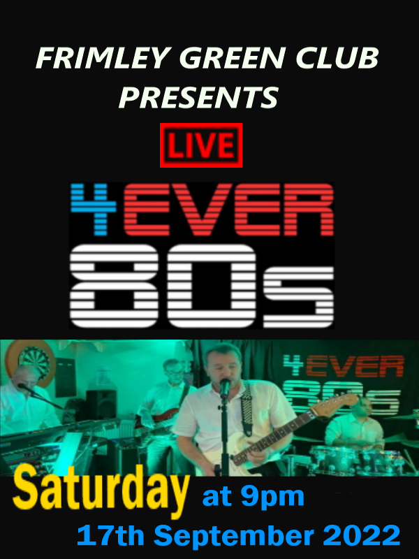 We welcome back 4Ever80's Band on Saturday 17th September 2022. Great music starts at 9pm. Travel back in time to the 1980's. Do you remember Wham, Spandau Ballet, Ultravox, Tears...