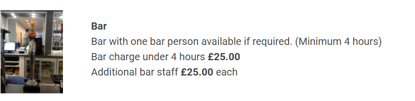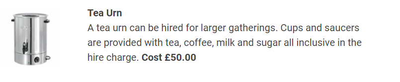 A deposit of £100.00 is required to secure the booking and is not a part payment for hire charges. It is returned after the event subject to the hall being returned in good order. We may release the date for hire by other customers if the deposit is not received within 48hrs.